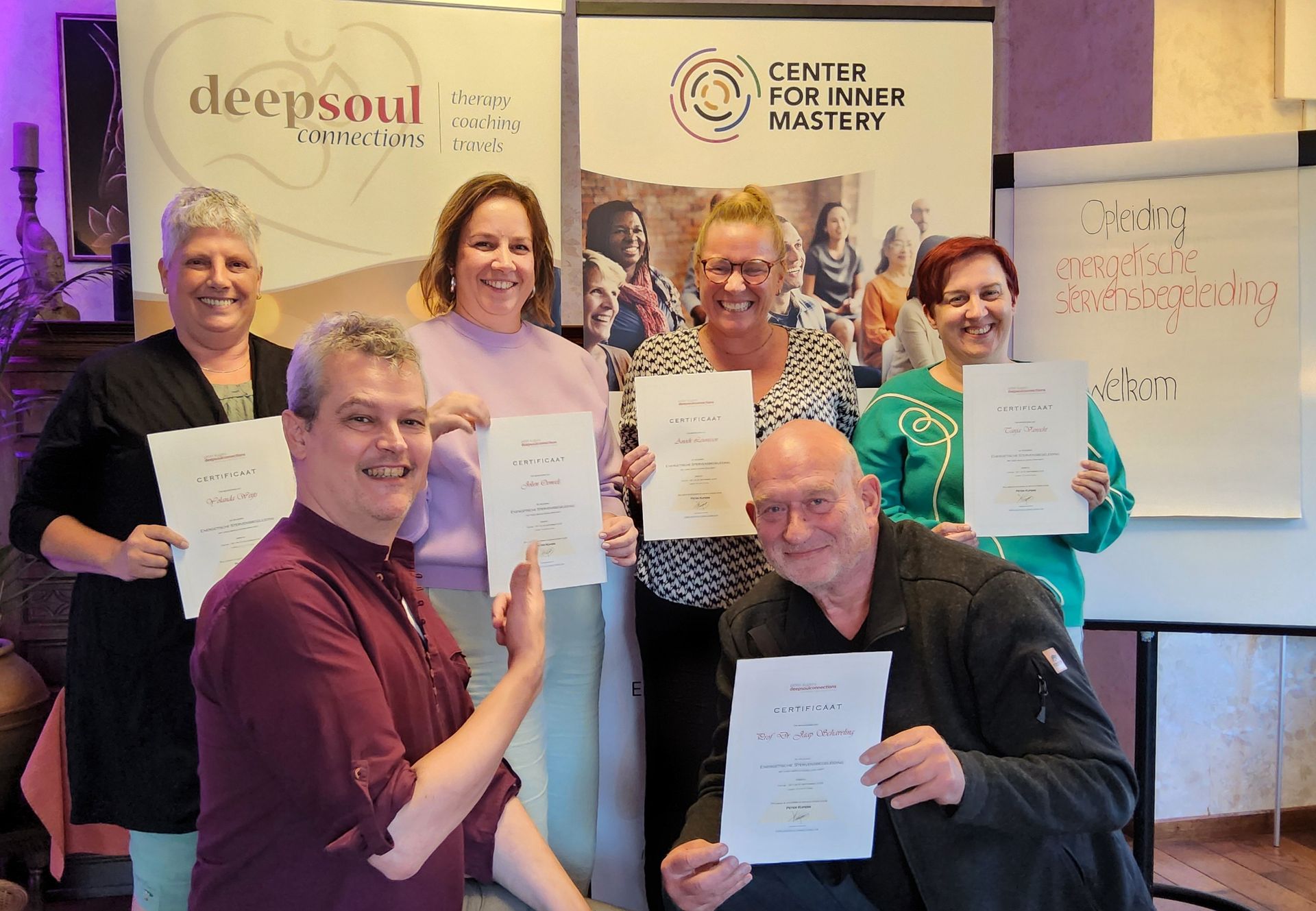 Er is een veilige en serene energie. Maskers vallen af en is er geen ruimte voor toneelspelen. Je weet waarom je deelneemt aan de opleiding. Er is veel ruimte voor uitwisseling en interactie met individuele begeleiding."